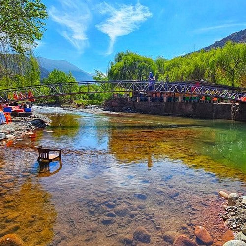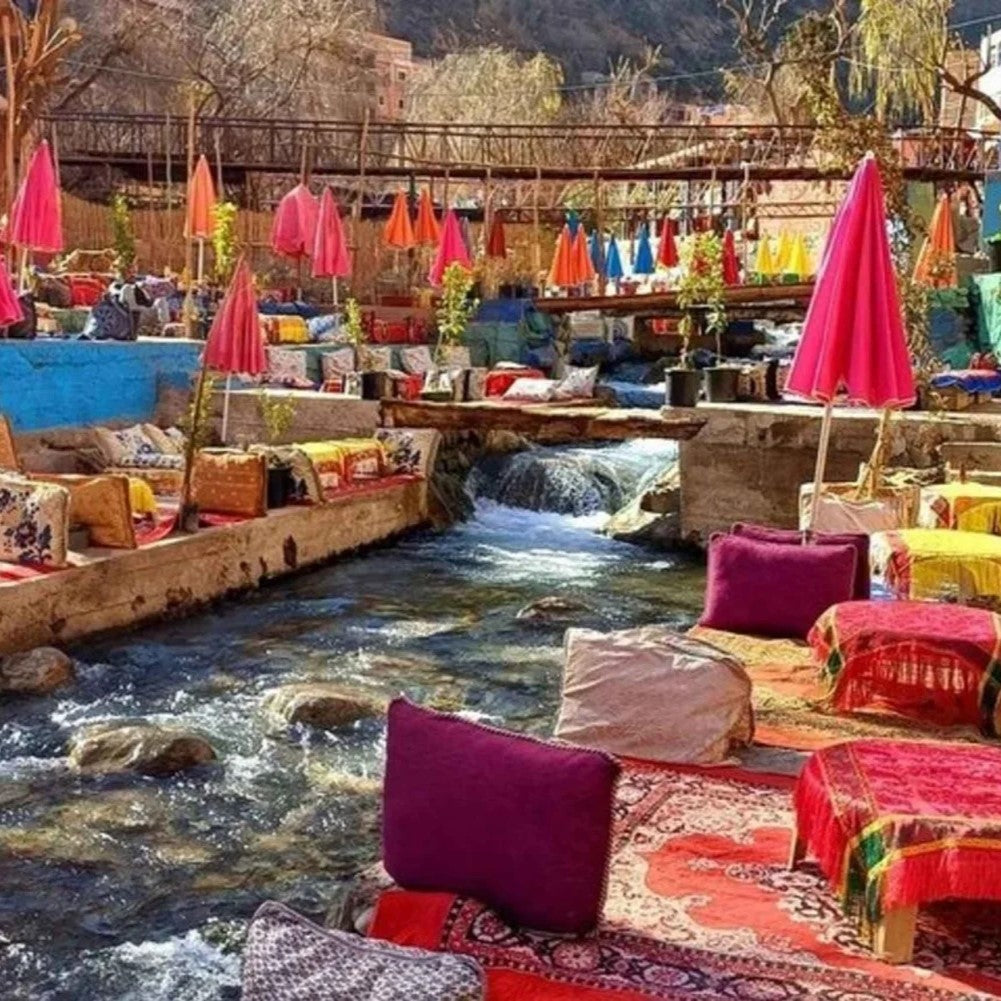 Arrivés dans la vallée verdoyante de l’Ourika, vous découvrirez un contraste saisissant entre l’eau fraîche de la rivière, les vergers en terrasses, et les maisons berbères perchées sur les collines. Cette vallée est un véritable havre de paix, prisé pour sa beauté préservée.