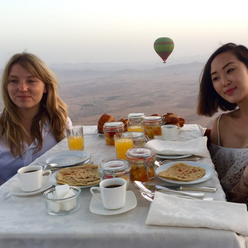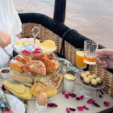 Savourez un somptueux petit-déjeuner marocain servi pendant le vol, à bord de la nacelle. Au menu : viennoiseries, pains traditionnels, confitures artisanales, jus d’orange frais, café et thé à la menthe, le tout face au lever de soleil.
