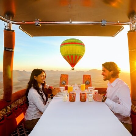 Ce moment gastronomique suspendu dans les airs sublime l’expérience, offrant un cadre inoubliable entre ciel et désert, dans une atmosphère exclusive et raffinée.